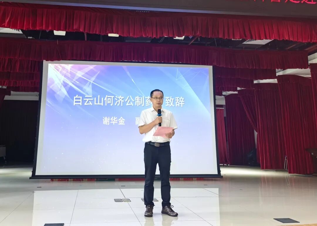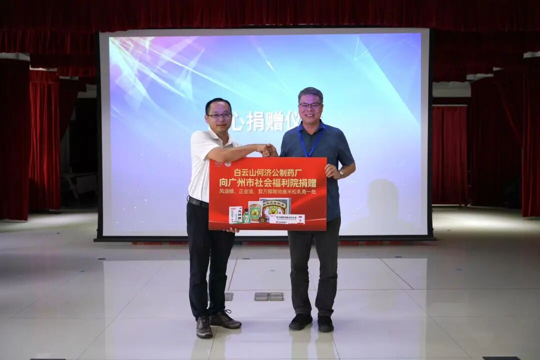 杨杰文院长代表福利院向白云山何济公赠送致谢锦旗,谢华金副厂长代表企业领受