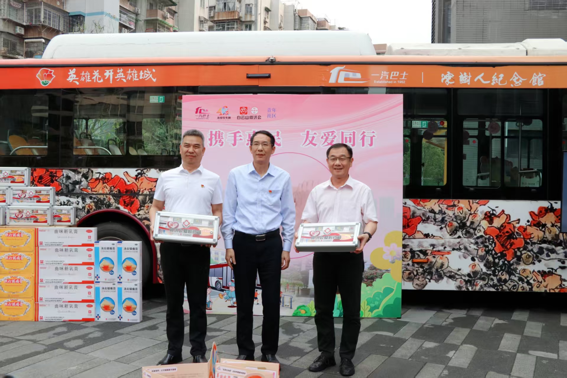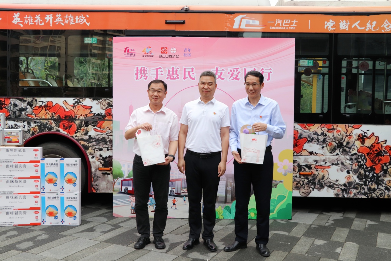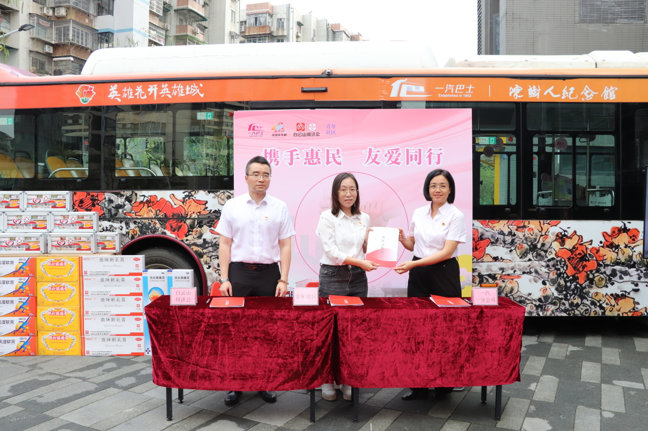 羊城春暖,木棉灼灼绽芳华。为传承和弘扬雷锋精神与向秀丽精神,庆祝广州 “友爱在车厢” 活动 40 周年,深化 “公交 + 社区 + 药企”三方党建共建成果,3 月 30 日,白云山何济公职能部门第一党支部(以下简称“职一党支部”)携手广州市一汽巴士有限公司一分公司总支部委员会、荔湾区南源街道青年社区委员会,在南源街道青年社区广场开展党建共建主题活动。一汽巴士党委副书记、工会主席陈全胜,南源街道纪工委书记陈鸿,白云山何济公党委副书记、工会主席廖炎辉参加活动。
