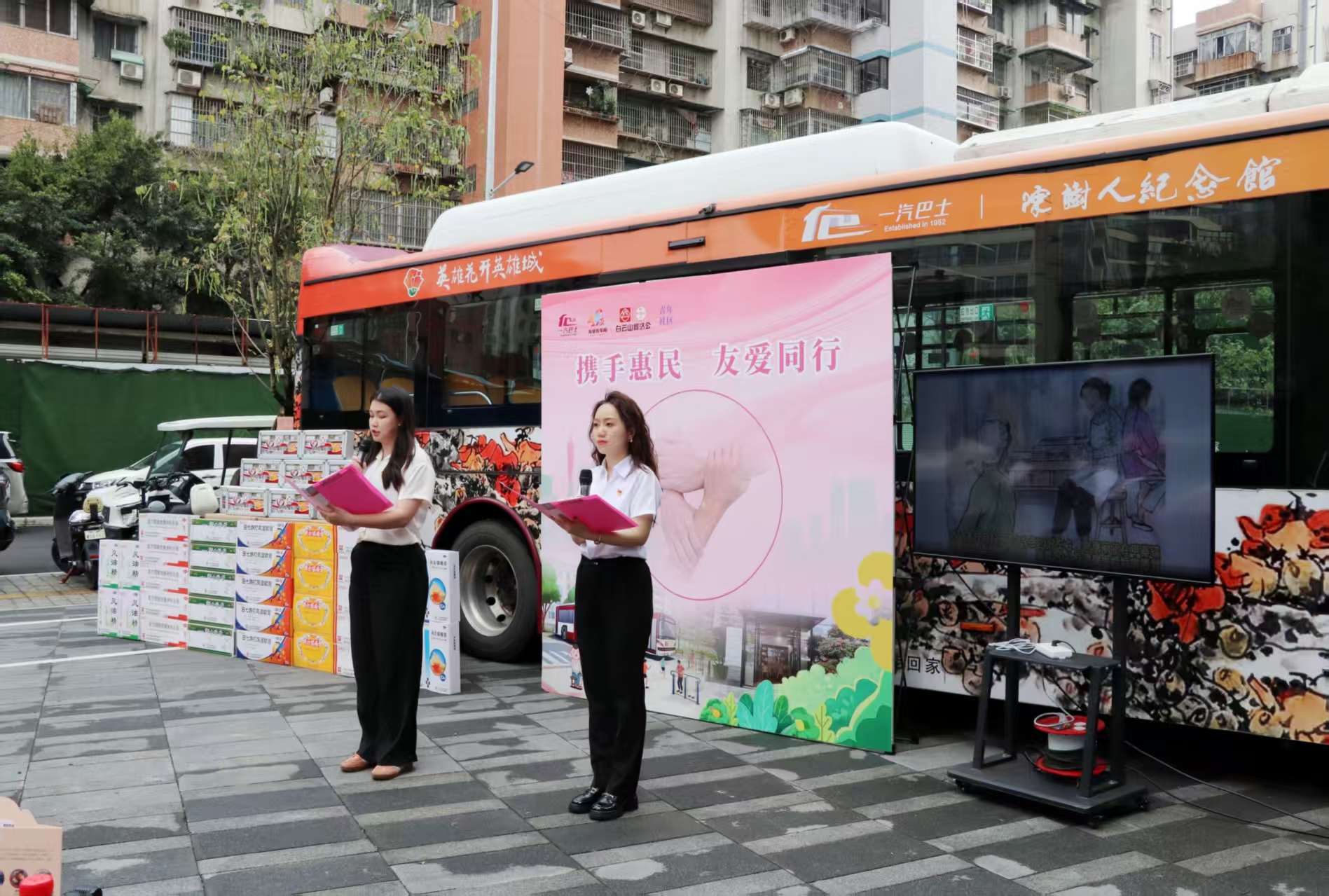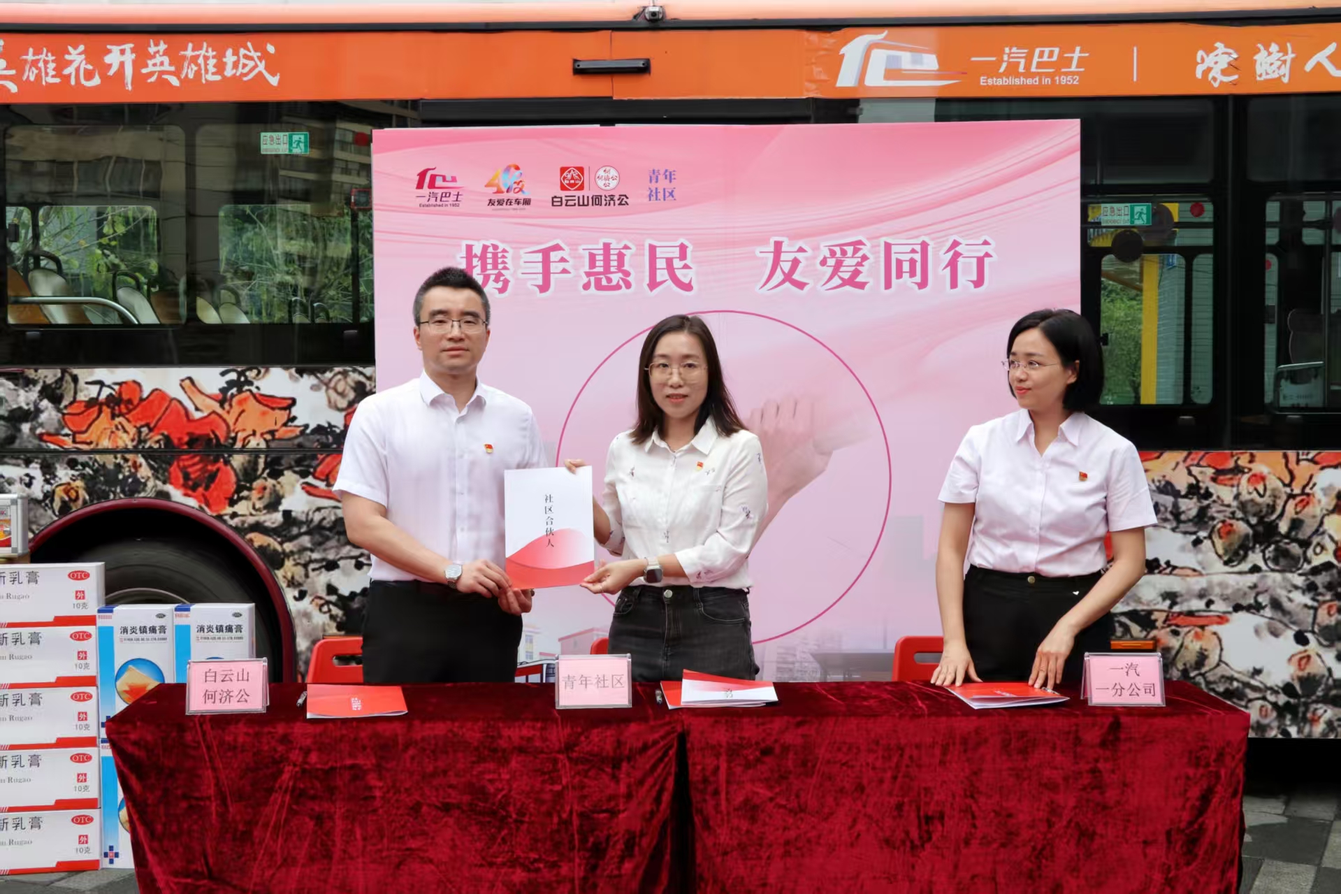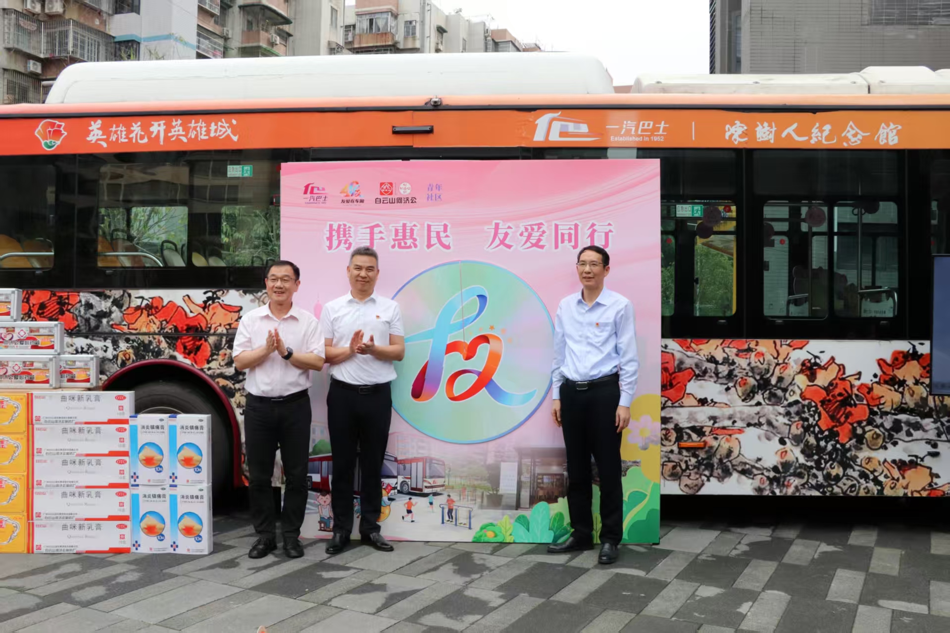 羊城春暖,木棉灼灼绽芳华。为传承和弘扬雷锋精神与向秀丽精神,庆祝广州 “友爱在车厢” 活动 40 周年,深化 “公交 + 社区 + 药企”三方党建共建成果,3 月 30 日,白云山何济公职能部门第一党支部(以下简称“职一党支部”)携手广州市一汽巴士有限公司一分公司总支部委员会、荔湾区南源街道青年社区委员会,在南源街道青年社区广场开展党建共建主题活动。一汽巴士党委副书记、工会主席陈全胜,南源街道纪工委书记陈鸿,白云山何济公党委副书记、工会主席廖炎辉参加活动。