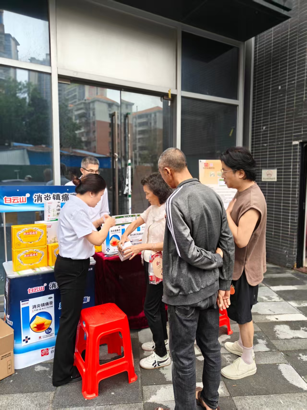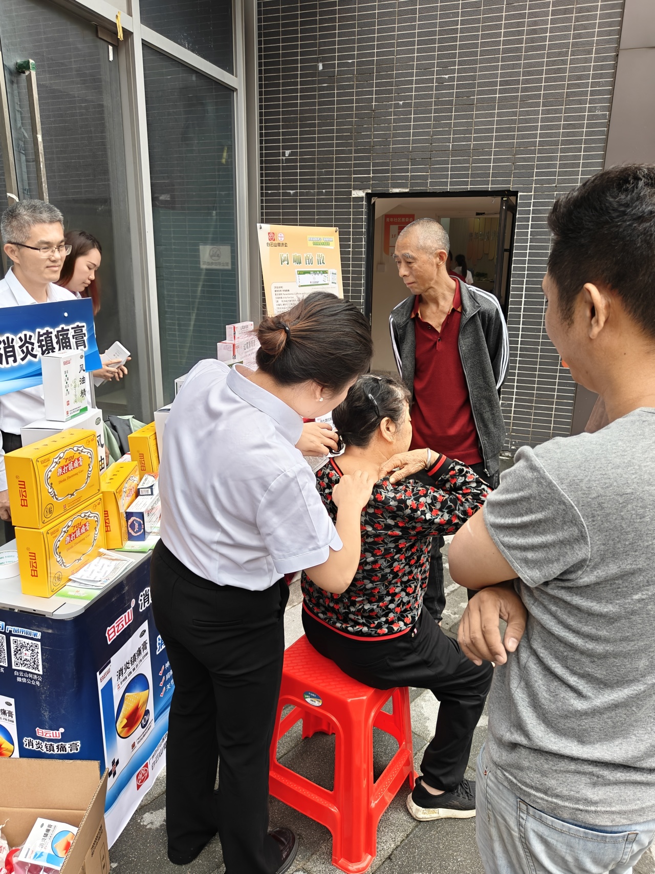 在爱心集市的健康关爱区,职一党支部的党员化身志愿者,开展形式多样的便民健康服务。支部党员带来朗诵《学习雷锋好榜样,歌唱英雄向秀丽》,重温向秀丽英雄事迹,传递榜样力量。现场结合真实案例,用通俗易懂的语言向居民和公交驾驶员讲解常用药品的使用方法、注意事项及储存技巧,重点解答跌打损伤、蚊虫叮咬、日常止痛等用药疑问,提升群众安全用药意识。在药品爱心试贴环节,支部党员为有需要的居民和一线公交司机现场贴敷外用药品,耐心讲解适用范围,让大家近距离体验专业的药学服务。白云山何济公坚持“品牌传播与公益服务”同向发力,近百辆展示优质产品的公交车同期投入运营。车身广告与爱心药箱协同联动,构建“外彰品质承诺、内递健康守护”的服务矩阵,将企业实力转化为司乘可触可感的民生实效。