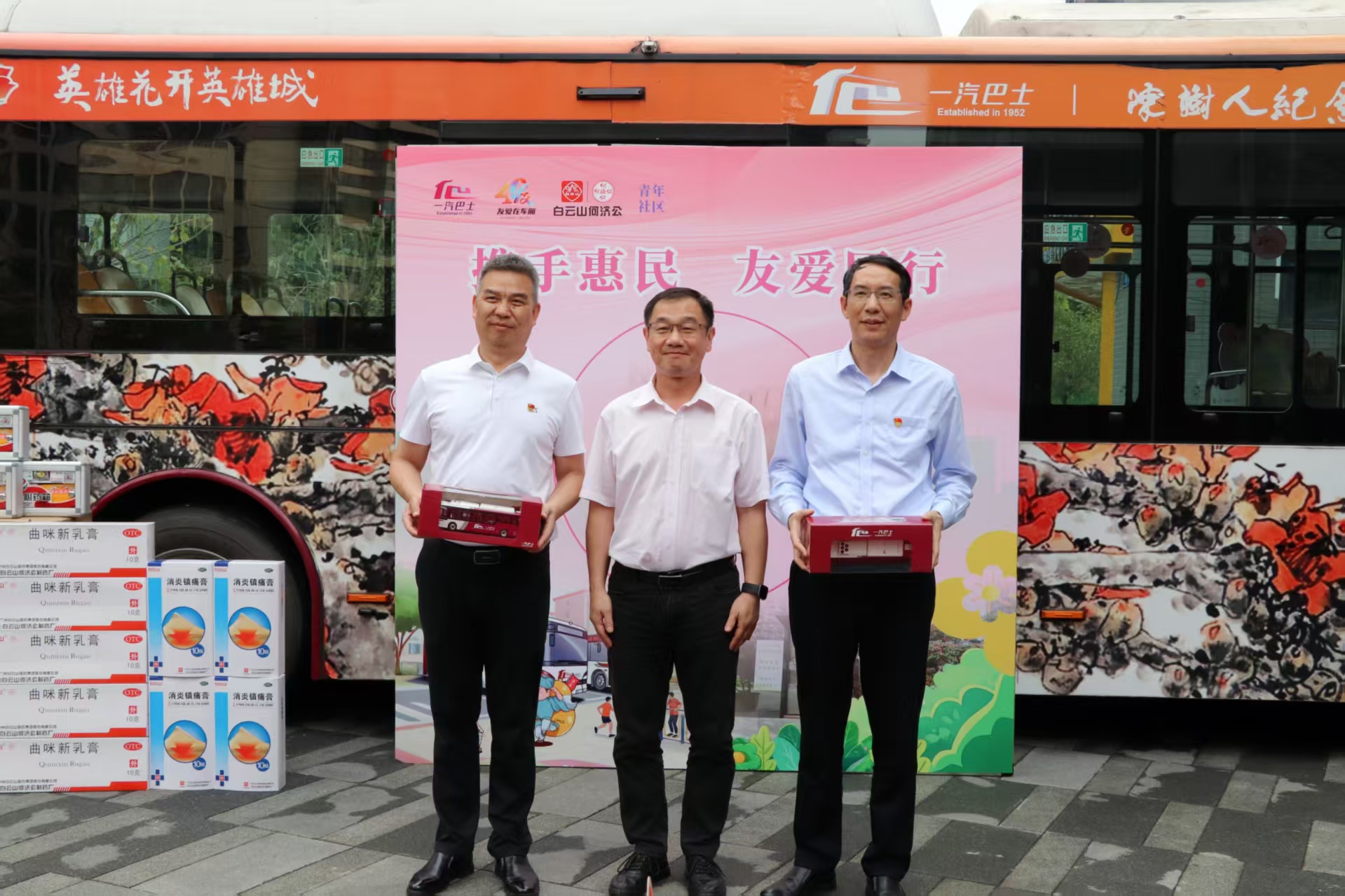 活动现场,“英雄花开英雄城”主题公交化作流动画卷,如火木棉红与满目新绿交织相映,瞬间点亮盎然春意。职一党支部向一汽巴士有限公司一分公司赠送100 个爱心药箱,药箱内配备白云山何济公生产的风油精、消炎镇痛膏、701跌打镇痛膏等常用应急外用药品,将精准投放至一汽巴士各公交线路车辆及公交站场 “友爱角”。这些“流动的健康站”伴随公交车穿梭于城市脉络,及时响应司乘及乘客的紧急用药需求,让贴心守护“一路随行”,将健康关爱化作看得见的民生温度。一汽巴士、南源街道、何济公还举办三方互赠药箱、车模及社区工艺品仪式,象征情谊长存。